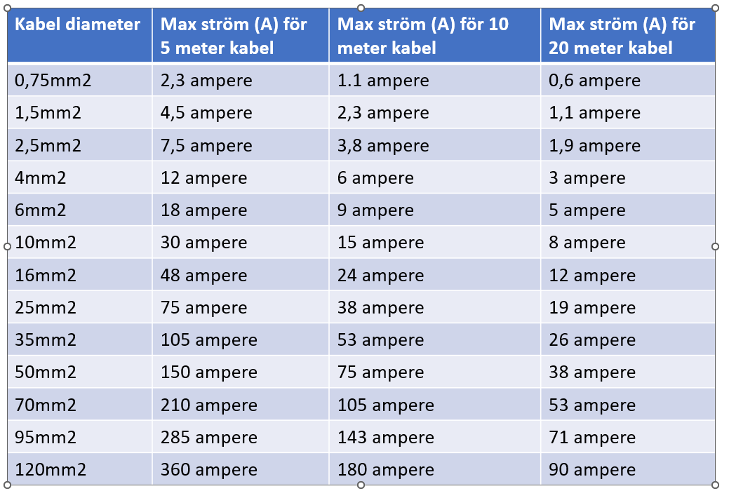 En annan viktig faktor är längden på kabeln i nedanstående kabel visar vi exempel på vilken ström som kan passera genom olika tjocka kablar